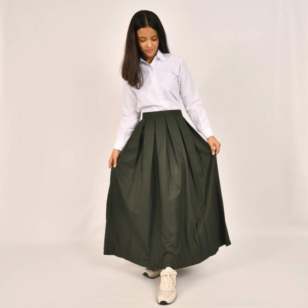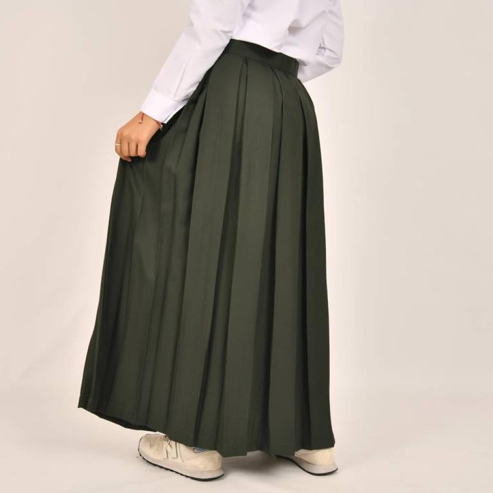 تنورة أخضر زيتي بكسرات وقصة واسعة مع كلبس اغلاق وسحاب جانبي
