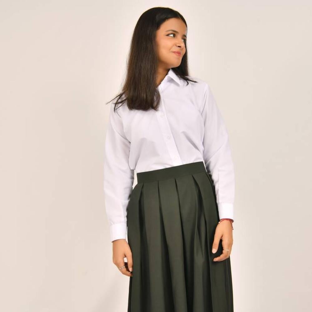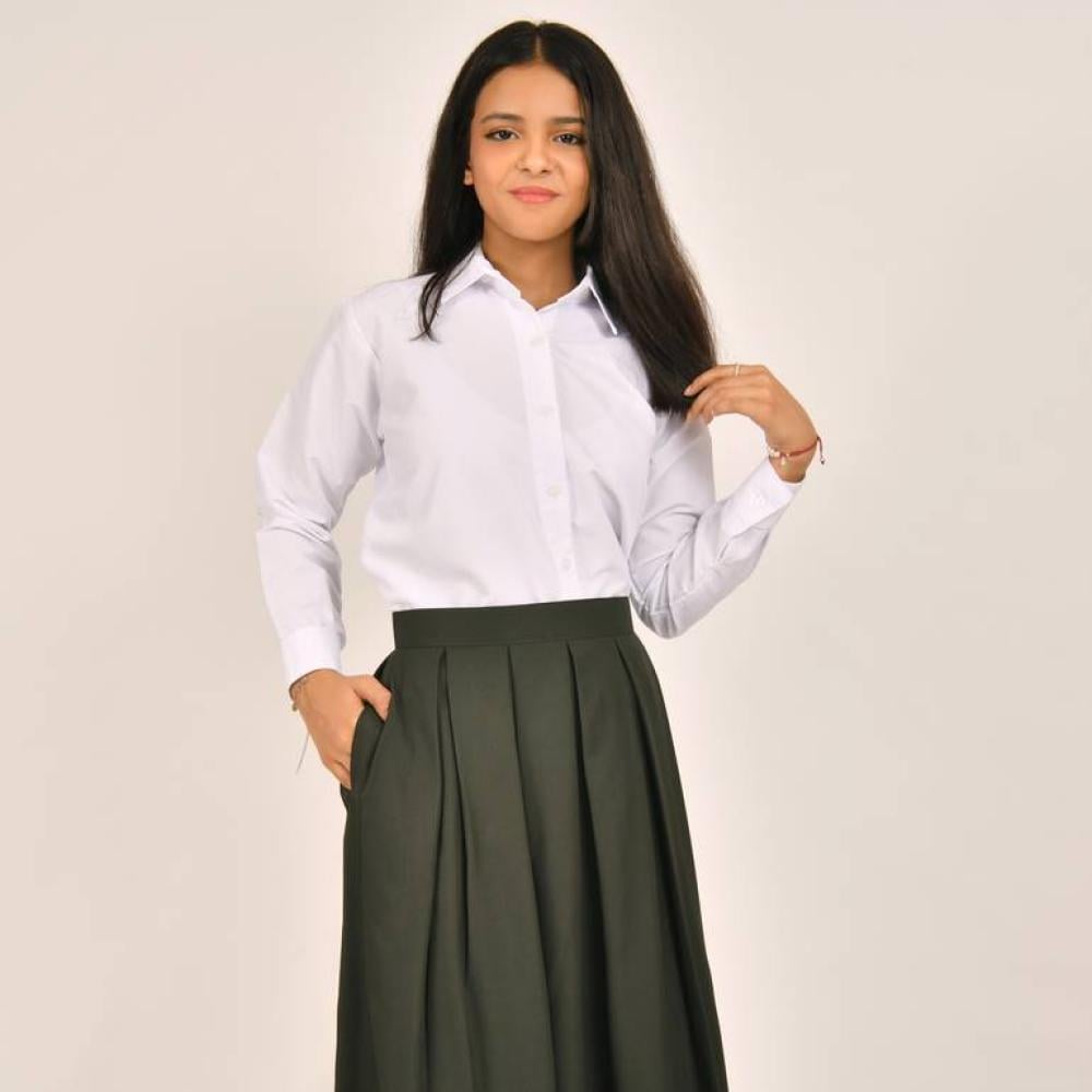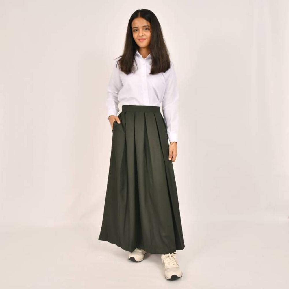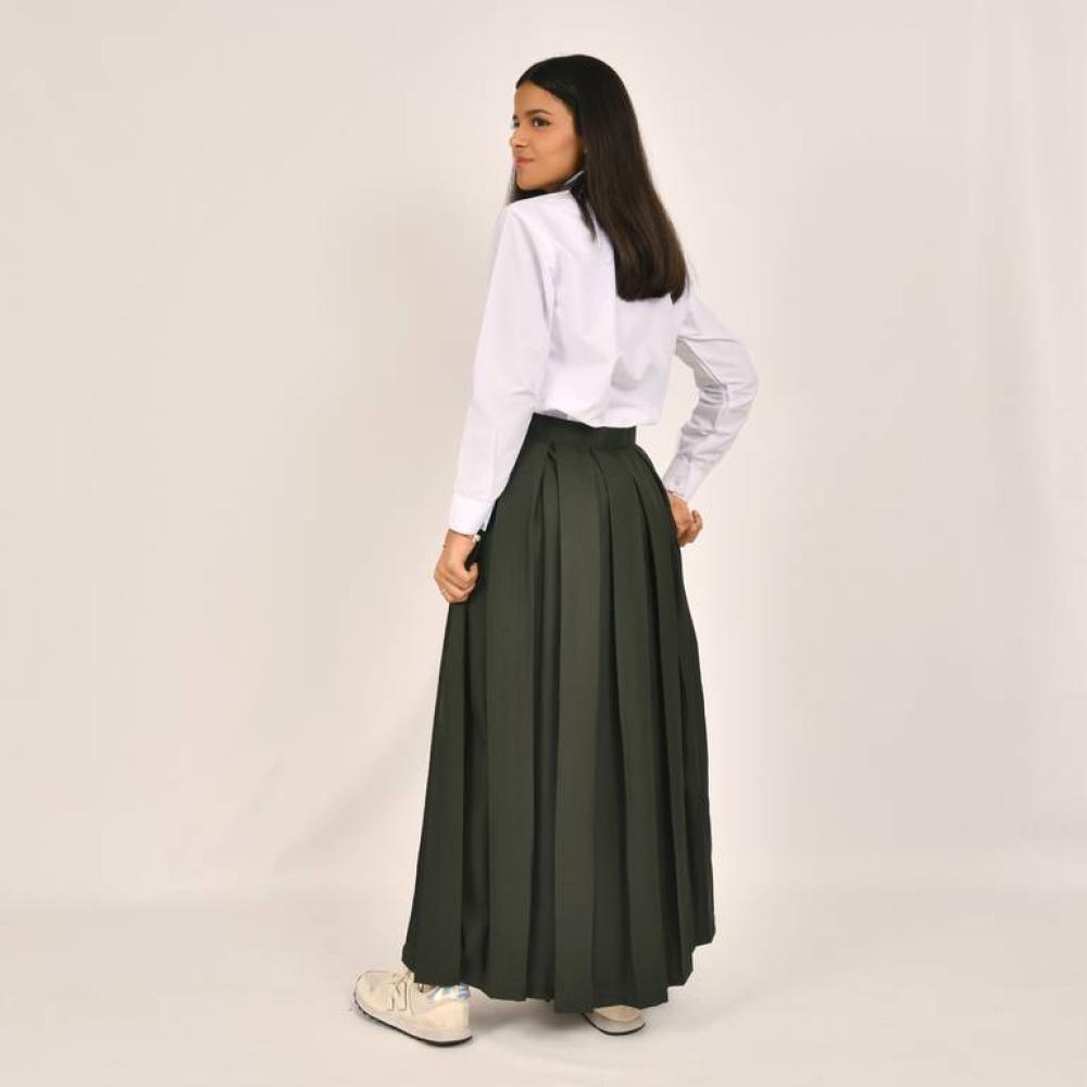 تألقي بإطلالة أنيقة وعصرية مع تنورتنا الأخضر الزيتي المصممة بقصة واسعة وكسرات، مع كلبس إغلاق وسحاب جانبي. مصنوعة من قماش كريب تايواني الفاخر، تضمن لكِ هذه التنورة الراحة والمتانة. تتوفر إمكانية إضافة قميص أبيض سادة أو قميص أبيض بكشكش لإكمال الإطلالة المميزة.