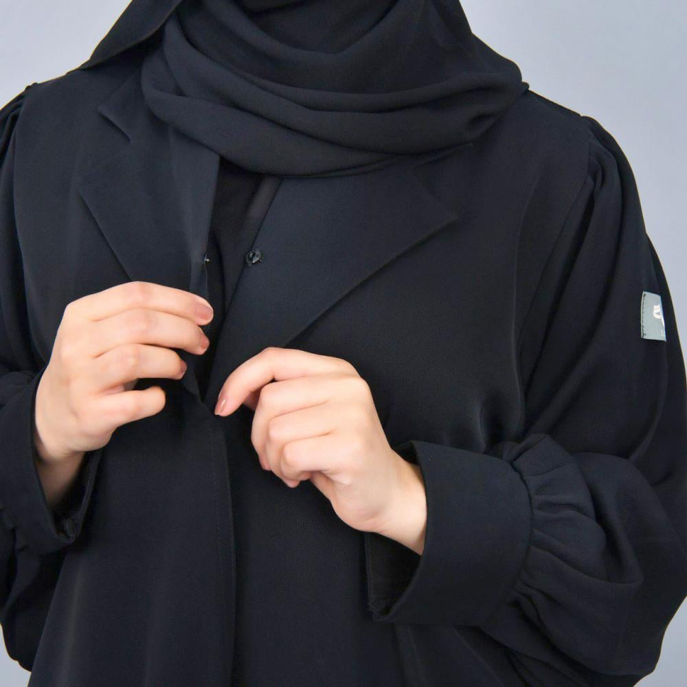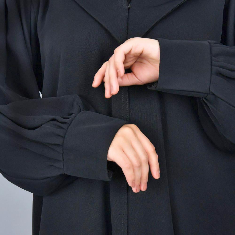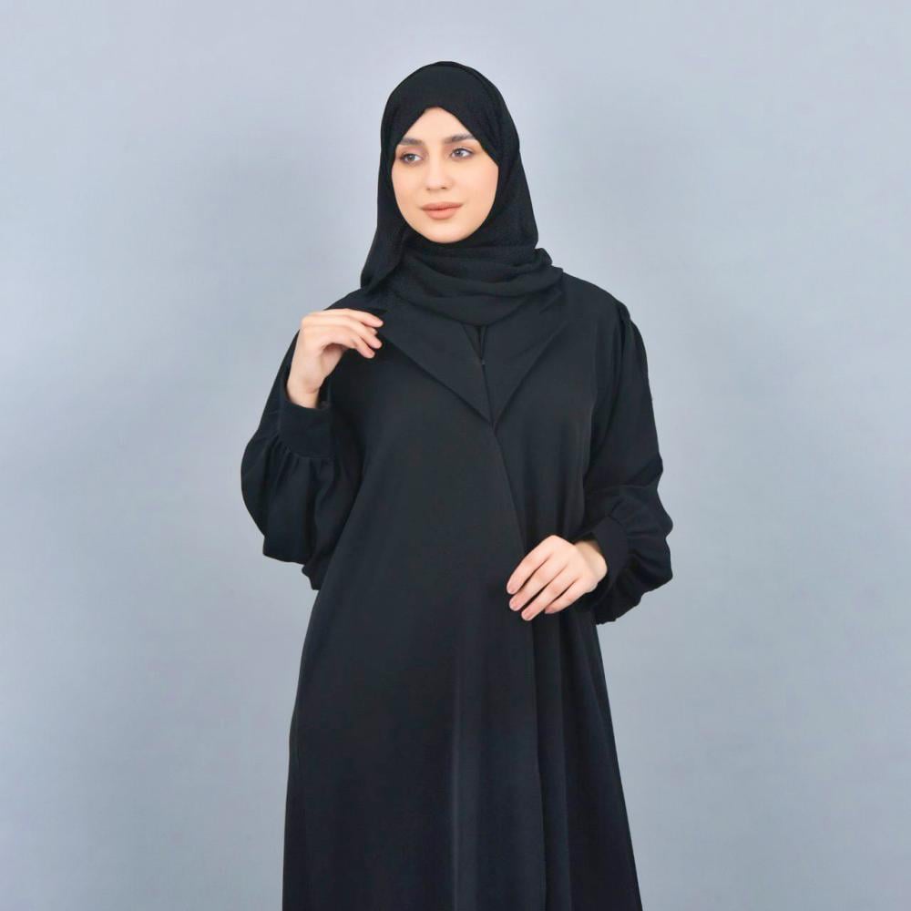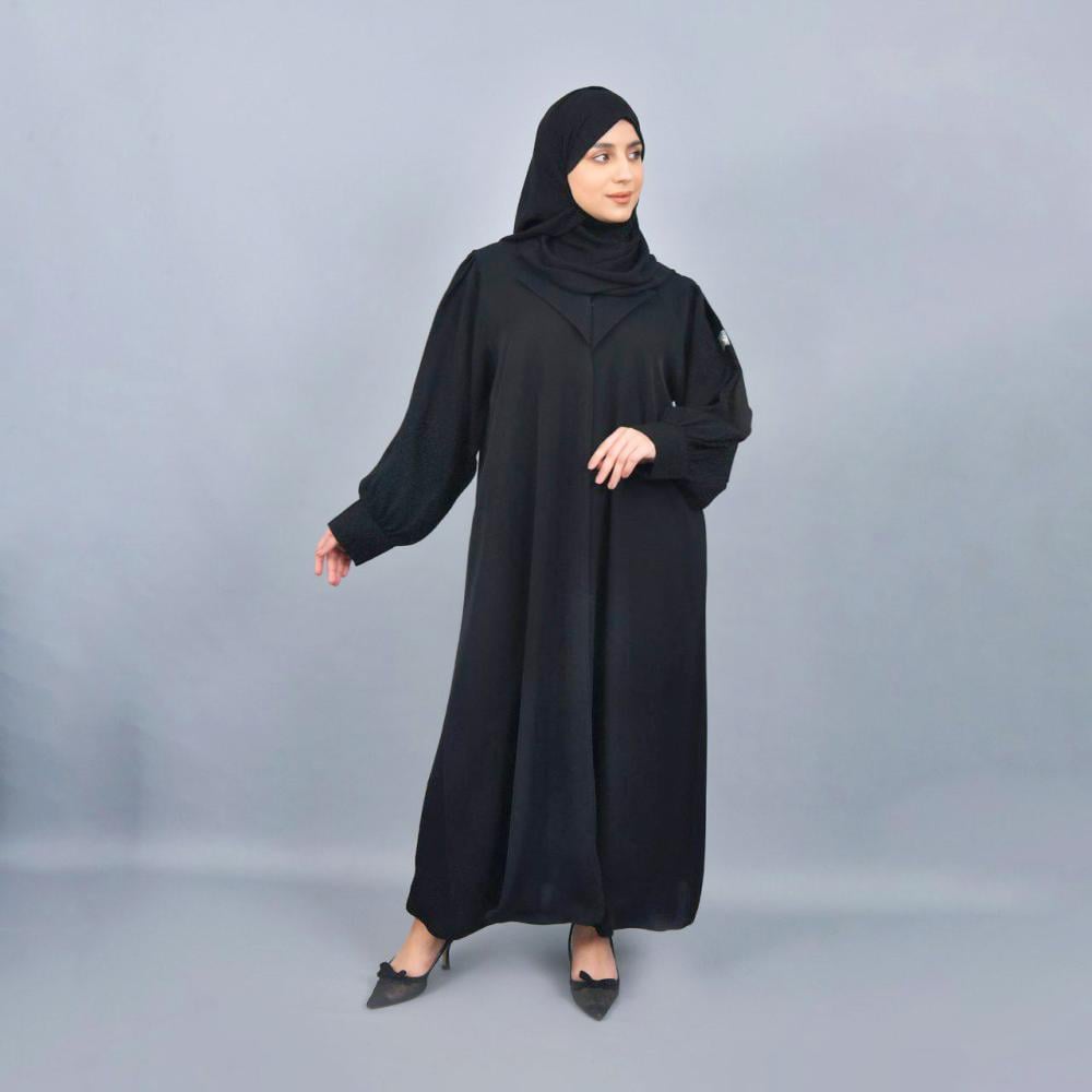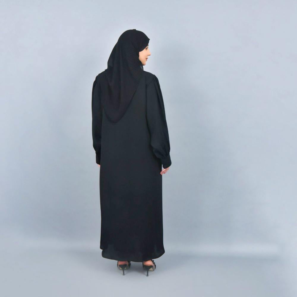 تألقي بإطلالة كلاسيكية وفاخرة مع عبايتنا السوداء المزودة بياقة سوداء وأكمام مغلقة. تجمع هذه العباية بين الأناقة والبساطة، وتأتي مصممة بأقمشة فاخرة وخياطة متقنة لضمان أفضل جودة وراحة.