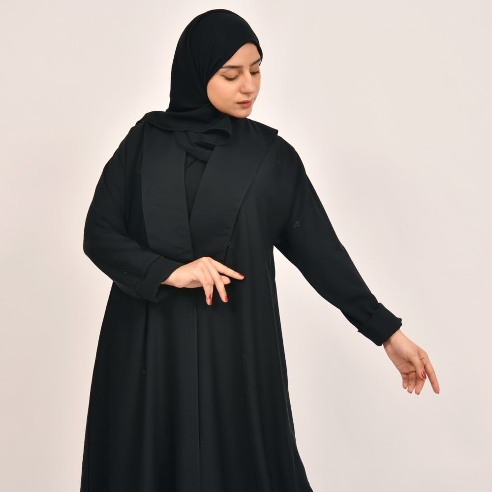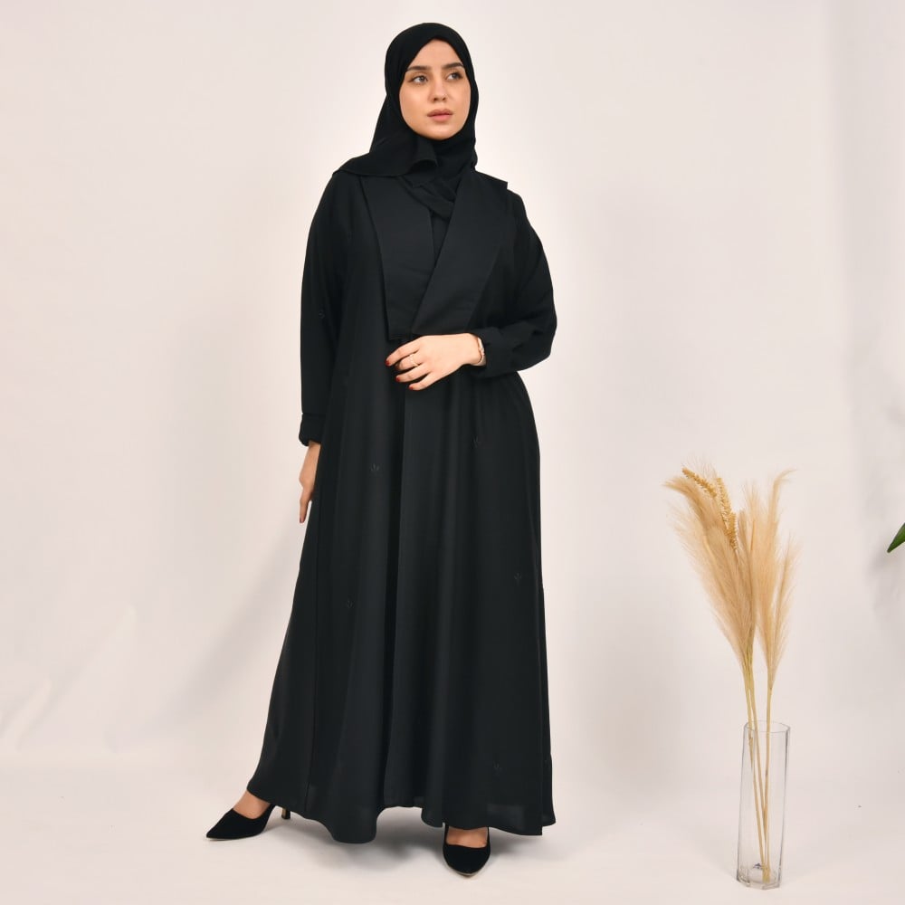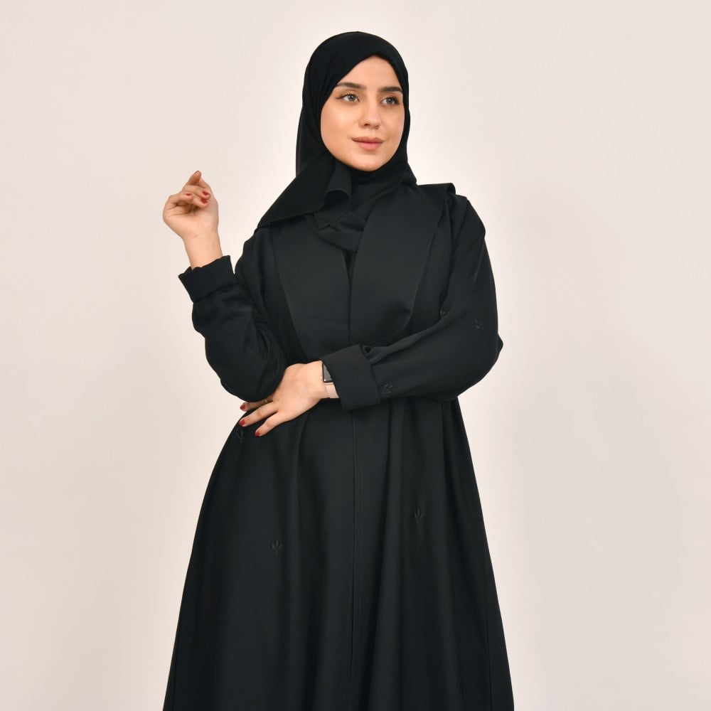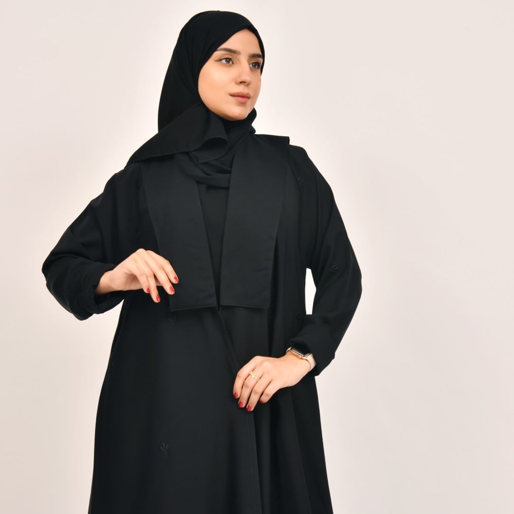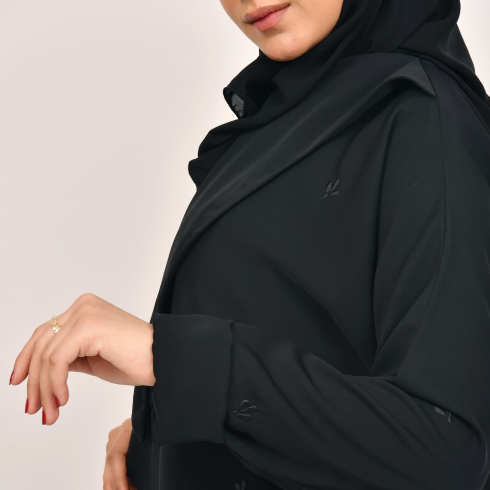 عباية فاء - سوداء بياقة مستطيلة وتطريز ناعم