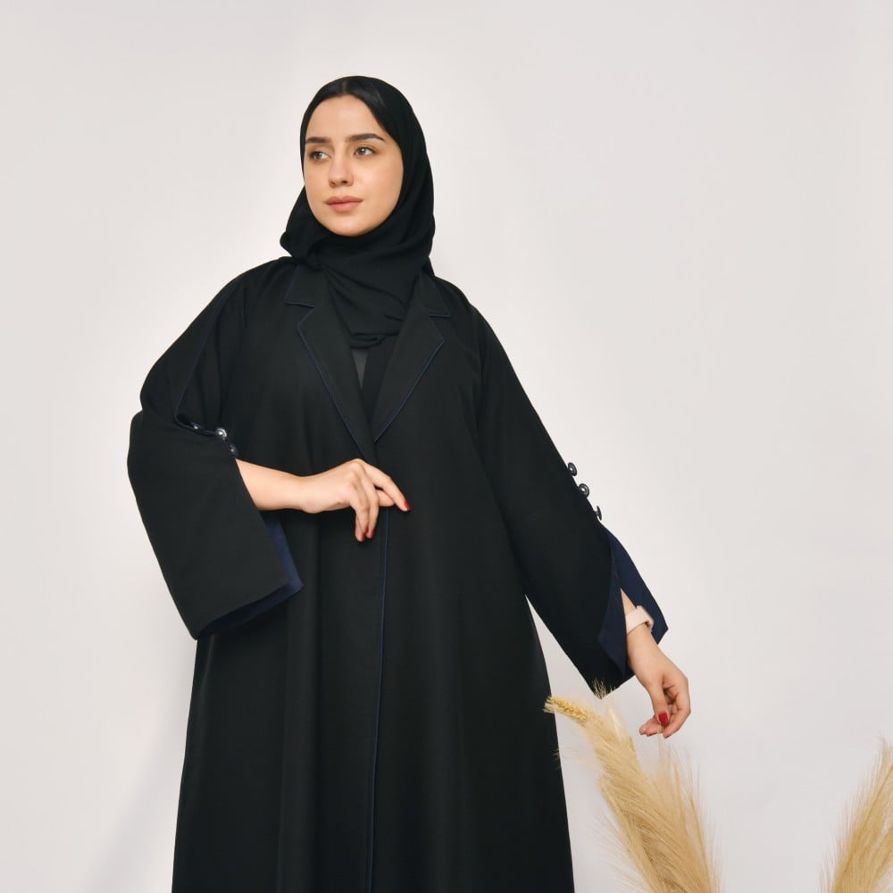 ● أزرار مبطنة بالكحلي تمنح العباية طابعًا فريدًا.