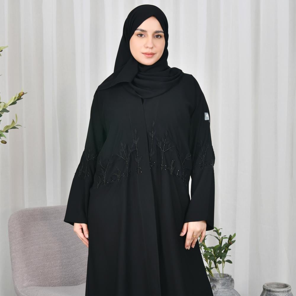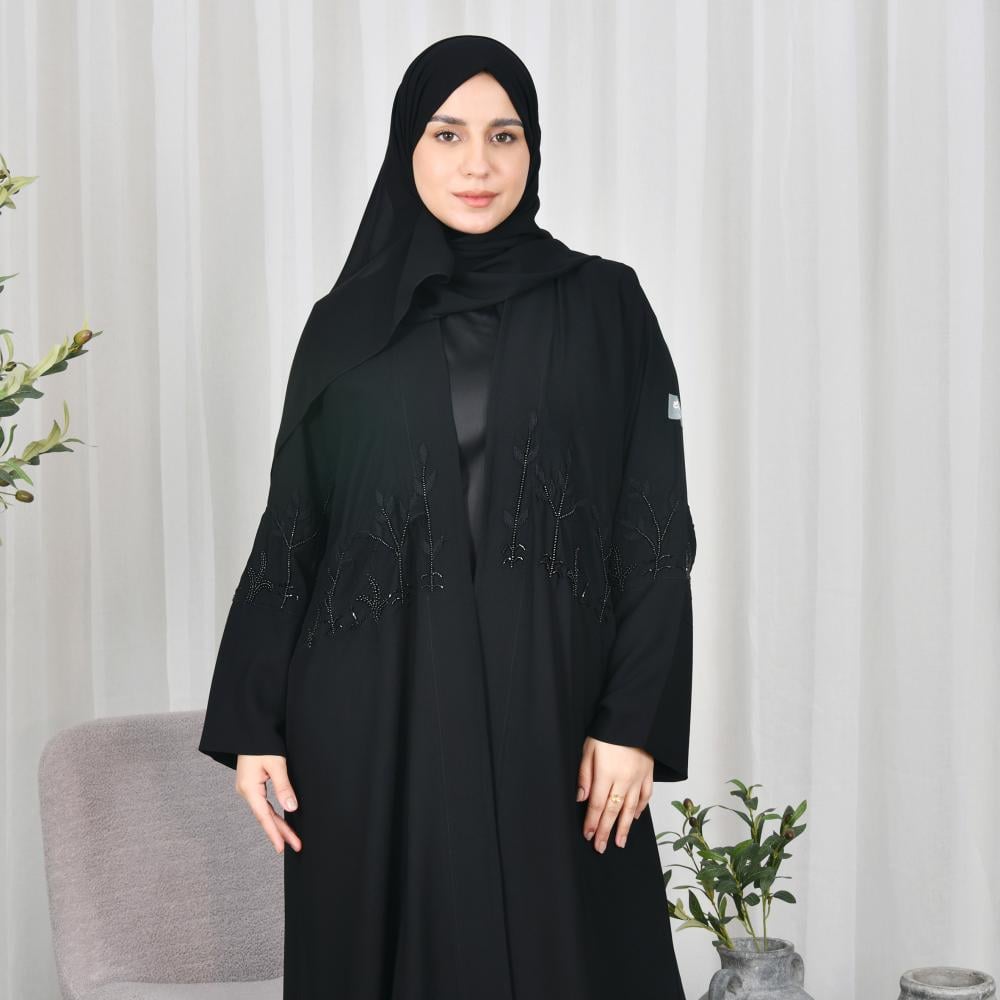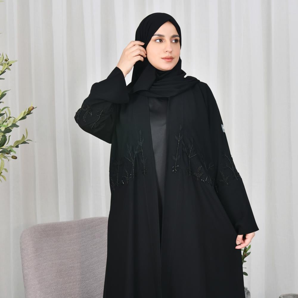 ● تفاصيل يدوية مميزة: الشك اليدوي البارز يبرز جمال العباية ويضفي عليها طابعاً فريداً.