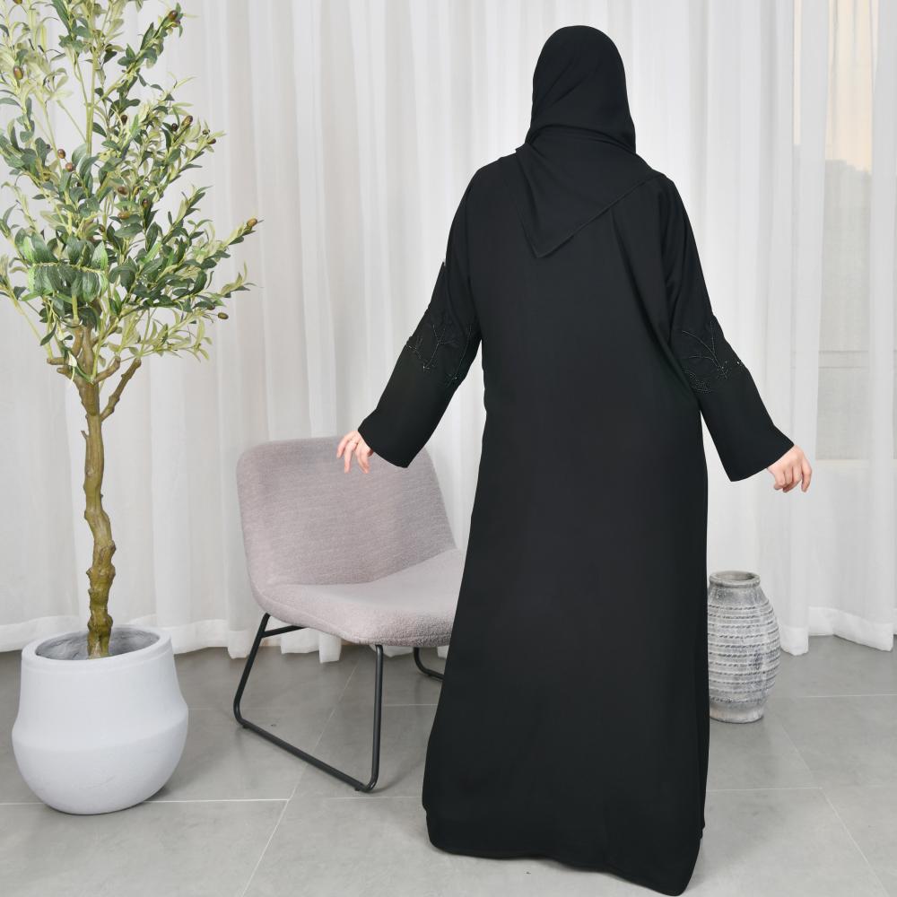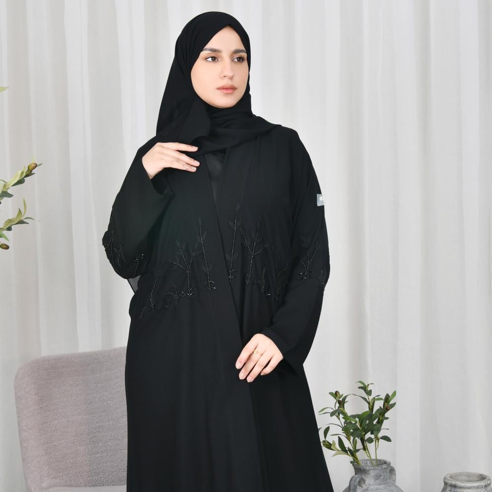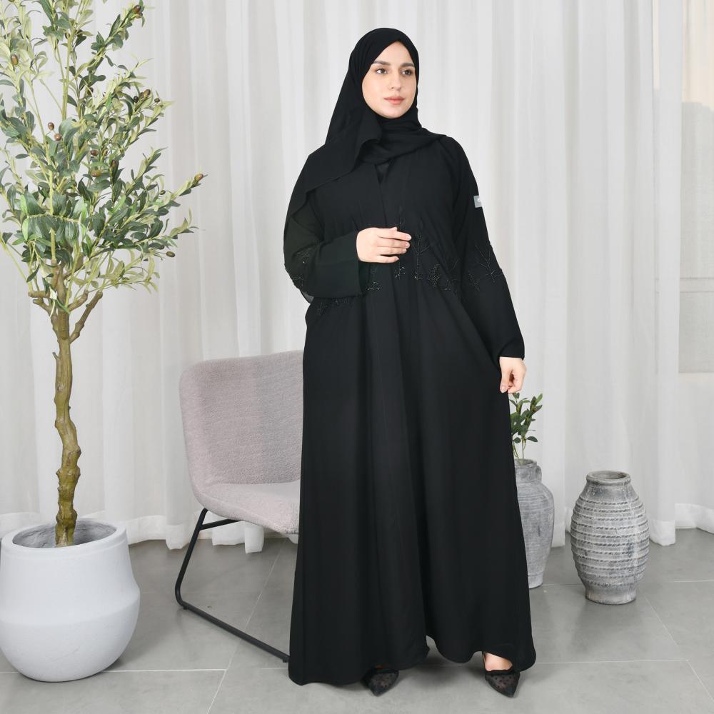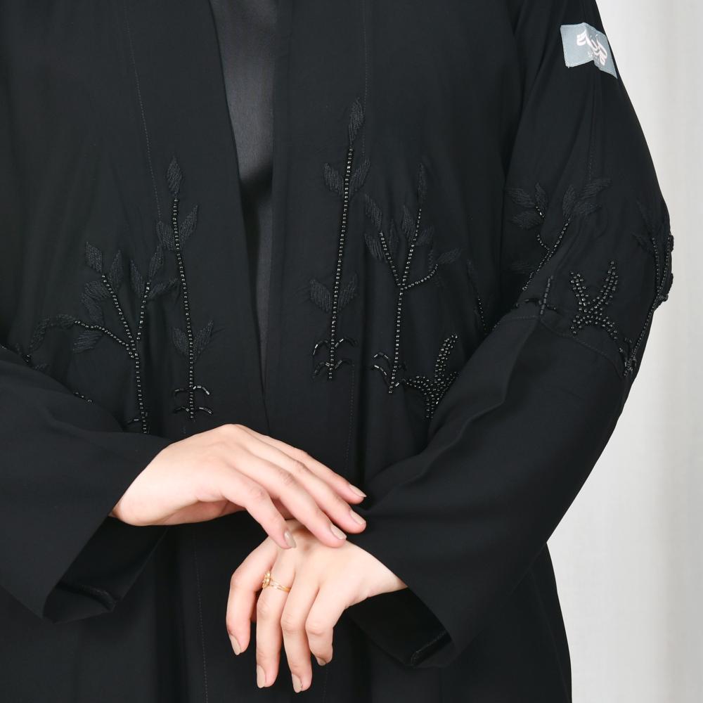 ● تفاصيل يدوية مميزة: الشك اليدوي البارز يبرز جمال العباية ويضفي عليها طابعاً فريداً.