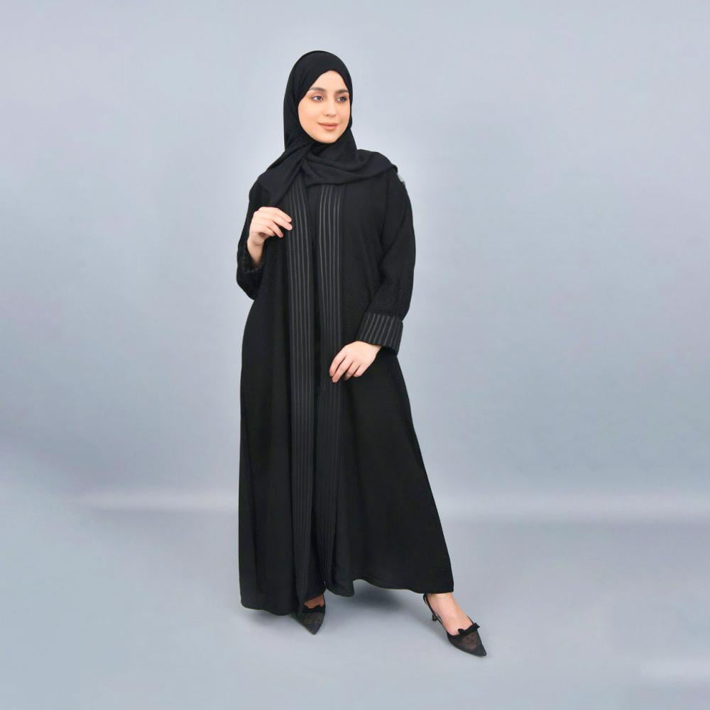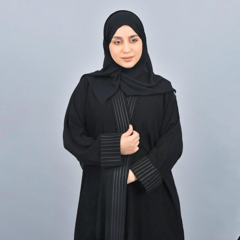 استمتعي بالأناقة والفخامة مع عبايتنا المفتوحة المزودة بياقة طويلة مقلمة بالأسود. صممت هذه العباية لتجمع بين الراحة والأناقة، حيث تأتي مصنوعة من أقمشة فاخرة وبخياطة متقنة لضمان أفضل جودة.